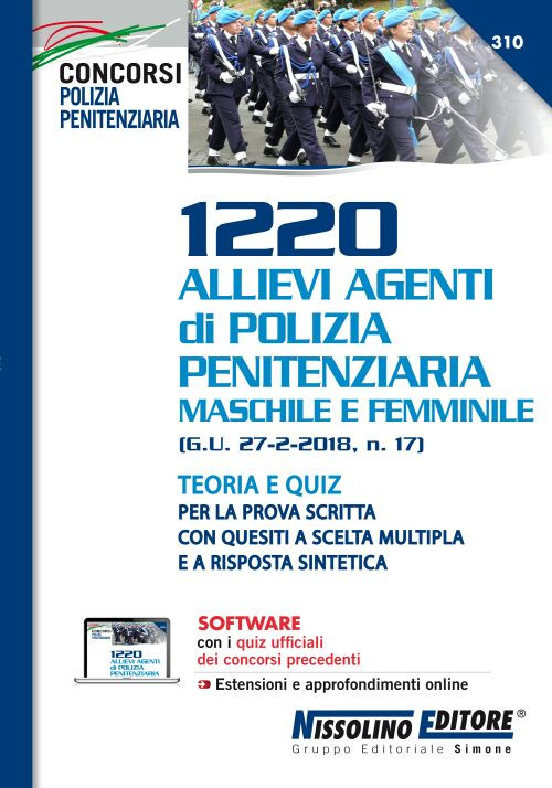 Un sussidio di preparazione ai concorsi per il reclutamento di 1220 Allievi Agenti di Polizia Penitenziaria maschile e femminile (G.U. 27 febbraio 2018, n. 17), con la seguente ripartizione di posti: concorso, per solo esame, a 366 posti (276 uomini e 90 donne) aperto a tutti i cittadini italiani, purché in possesso dei requisiti prescritti per l'assunzione nel Corpo di Polizia Penitenziaria, con 2 posti riservati ai candidati in possesso dell'attestato di bilinguismo (lingua italiana e tedesca); concorso, per esame e titoli, a 598 posti (448 uomini e 150 donne) riservato a coloro che siano in servizio, da almeno sei mesi alla data di scadenza della domanda di partecipazione al concorso, come volontari in ferma prefissata di un anno (VFP1) ovvero in rafferma annuale, purché in possesso dei requisiti prescritti per l'assunzione nel Corpo di Polizia Penitenziaria; concorso, per esame e titoli, a 256 posti (192 uomini e 64 donne) riservato ai volontari in ferma prefissata di un anno (VFP1) collocati in congedo, al termine della ferma annuale, alla data di scadenza della domanda di partecipazione al concorso, nonché ai volontari in ferma prefissata quadriennale (VFP4) in servizio o in congedo, purché in possesso dei requisiti prescritti per l'assunzione nel Corpo di Polizia Penitenziaria. Fermo restando che è consentita la partecipazione ad uno soltanto dei predetti concorsi, il volume è utile, in particolare, per il superamento della prova d'esame scritta, consistente in domande concernenti argomenti di cultura generale e materie dei programmi della scuola dell'obbligo. Pertanto il testo comprende le seguenti discipline: Letteratura italiana; Grammatica italiana; Matematica (Aritmetica, Algebra, Geometria); Scienze (con argomenti di Fisica, Chimica, Biologia, Scienze della Terra); Geografia (d'Italia, d'Europa, dei continenti extraeuropei); Storia (dalle origini ai giorni nostri); Educazione civica. Per ciascuna materia, il candidato può usufruire sia di una trattazione teorica, per un rapido ed agevole ripasso, sia di test di verifica con quesiti a risposta multipla, costituiti da quiz ufficiali già somministrati ai concorsi per Allievi Agenti di Polizia Penitenziaria. Il testo include, altresì, un questionario di cultura generale con quesiti a risposta aperta, poiché nel bando è precisato che la prova d'esame potrebbe consistere in «domande a risposta sintetica o a scelta multipla». A completamento dell'opera, appositi sussidi interattivi (estensioni e approfondimenti online) per ulteriori approfondimenti disciplinari e, soprattutto, un avanzato software (scaricabile tramite il QR-Code riportato nell'ultima pagina del libro) con quiz ufficiali tratti dalle banche dati dei precedenti concorsi, per infinite esercitazioni e simulazioni della prova d'esame.