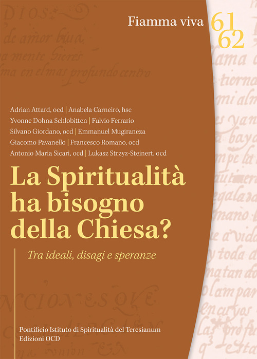 La spiritualità ha bisogno della Chiesa? È il titolo provocatorio che raccoglie gli Atti della 61 a 62 a Settimana di Spiritualità tenuta al "Teresianum" il 14-18 marzo 2021: cinque giornate dedicate a un aspetto particolare della presente tematica, su cui hanno riflettuto Silvano Giordano ocd, professore in Storia della Chiesa, Lukasz Strzyz-Steinert ocd, direttore della rivista Teresianum e curatore di "Fiamma viva", Yvonne Dohna Schlobitten, professoressa della Pontificia Università Gregoriana, Adrian Attard ocd, vicerettore del "Teresianum", Francesco Romano ocd, professore in Diritto Canonico, Giacomo Pavanello, parroco romano e uno dei responsabili della Comunità Nuovi Orizzonti, Fulvio Ferrario, pastore valdese e docente alla Facoltà Valdese,Emmanuel Mugiraneza, dottorando alla Facoltà del "Teresianum", Antonio Maria Sicari ocd, fondatore del Movimento Ecclesiale Carmelitano, Anabela Carneiro hsc, in rappresentanza della Unione Internazionale Superiore Generali. Un caleidoscopio colorato di molte voci, espressioni di tanti ideali, ma anche di disagi e soprattutto di speranze.