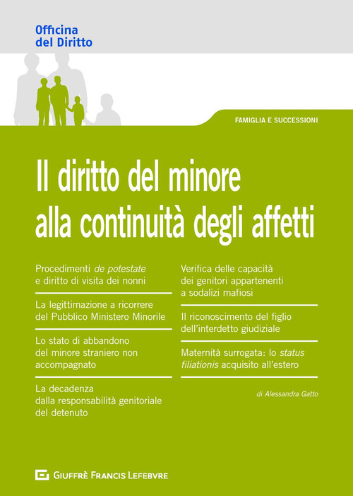 Officina del diritto è uno strumento di lavoro e di studio pensato per arricchire le proprie conoscenze giuridiche attraverso un sistema di lettura strutturato su più livelli: uno più immediato che consente di focalizzare i concetti "guida" di una precisa fattispecie giuridica con l'utilizzo di esempi, tavole sinottiche, schemi, formule, quesiti, mappe giurisprudenziali, e un altro più approfondito che illustra organicamente la materia e nel quale si rinvengono informazioni puntuali e chiarimenti mirati di pronta fruibilità. L'opera "Il diritto del minore alla continuità degli affetti" affronta le seguenti tematiche: Procedimenti de potestate e diritto di visita dei nonni; La legittimazione a ricorrere del Pubblico Ministero Minorile; Lo stato di abbandono del minore straniero non accompagnato; La decadenza dalla responsabilità genitoriale del detenuto; Verifica delle capacità dei genitori appartenenti a sodalizi mafiosi; Il riconoscimento del figlio dell'interdetto giudiziale; Maternità surrogata: lo status filiationis acquisito all'estero.