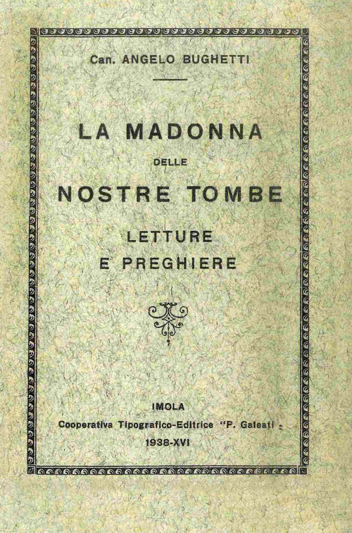 Edizione anastatica de "La Madonna delle nostre tombe" pubblicata a Imola nel 1938. Queste brevi pagine sono state scritte col pensiero e col cuore al Piratello dove Imola, accanto al suo cimitero, ha il santuario della sua Madonna, che essa può invocare col caro e pietoso titolo di Madonna delle nostre tombe.
