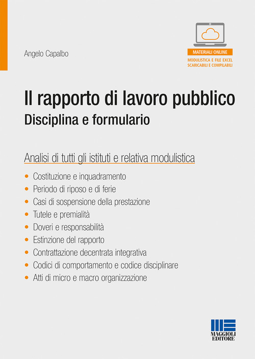 Il volume tratta il percorso normativo che ha interessato la disciplina del rapporto di lavoro alle dipendenze delle pubbliche amministrazioni. Il processo riformatore ebbe inizio con la legge n. 421 del 1992, quale strumento di rimedio per uscire dalla crisi economica e nel corso degli anni la regolazione del rapporto di lavoro è stata oggetto di numerose rivisitazioni. In particolare, con la riforma Brunetta del 2009, si interviene su alcune criticità per accrescere efficienza e trasparenza, razionalizzare il costo del lavoro pubblico e realizzare una migliore utilizzazione delle risorse umane all'interno di esse. Successivamente, con la legge Madia del 2015, la contrattazione collettiva assume valenza centrale nella regolazione dei rapporti di lavoro del pubblico impiego. Prova ne è l'art. 23, comma 1 del d.lgs. n. 75/2017. L'opera contiene la descrizione dei principali atti di regolazione del rapporto di lavoro pubblico, in particolare negli enti locali, che vanno dalla costituzione del rapporto, all'inquadramento ed ogni altro aspetto gestionale fino ai doveri e responsabilità del dipendente pubblico ed infine alla fase conclusiva del rapporto con la sua estinzione. Contiene, inoltre, un vasto formulario di atti di macro e micro organizzazione e di istituti contrattuali, riformulati con il nuovo CCNL, che ha introdotto elementi di semplificazione nella gestione dei fondi destinati alla contrattazione integrativa. Angelo Capalbo Segretario generale, avvocato, valutatore e pubblicista Segnalazioni bibliografiche > Il Codice degli Enti Locali, Riccardo Carpino > La disciplina delle assenze negli Enti locali dopo il CCNL Funzioni Locali. Guida rapida con casi pratici, Livio Boiero MATERIALI ONLINE Il lettore, tramite il codice alfanumerico allegato al volume, potrà accedere a fac-simili di atti e file excel di calcolo personalizzabili e stampabili. Modelli EXCEL su: > Pesatura posizioni organizzative > Pesatura obiettivi > Risultati ottenuti > Costituzione fondo risorse decentrate