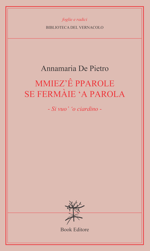 Pubblicare questo volume è dare finalmente compimento ad una intenzione comune - dell'editore e mia - sorta spontaneamente alla notizia della scomparsa di Annamaria De Pietro, avvenuta nel novembre del 2020. Se, da una parte, vuol essere un modo per rendere un dovuto omaggio a una delle voci più intense della nostra poesia, tanto potente e sofisticata quanto fu appartata e riservata la persona, dall'altra è l'occasione per riproporre, ora in una collana deputata alla cura della parola dialettale, una luminosa raccolta di testi in napoletano della De Pietro che Book Editore aveva già pubblicato nel 2005 nella collezione di scritture extra ordinarie "Fuoricollana" con il titolo Si vuo' 'o ciardino. Si tratta di un libro prezioso, raffinato e c?lto, come sempre è la poesia della De Pietro, e anche sorprendente, proprio per l'uso di una lingua (quella paterna) udita dall'Autrice nella prima giovinezza ma mai parlata, eppure radicata nelle sue fibre: inaspettatamente per lei - nella sua nota ne fa cenno con quel "non so come e perché" - a un certo punto, nel 2004, questa lingua sorgiva si è imposta "a cascata" per fiorire e assumere - davvero - la forma di un giardino: un giardino di rose. Lo ripresentiamo con un titolo diverso, concorrente con quello infine scelto per l'edizione del 2005, ma accarezzato già dall'Autrice come possibile. Ora, infatti, "Mmiezz'ê pparole se fermàie 'a parola", per la forza evocatrice della sua significanza, ci sembra perfetto punto di sintesi e rivelazione in cui convergono l'essenza della ricerca poetica della De Pietro e il mistero dell'eloquenza eterna della vera poesia che si rinnova fin dal silenzio della morte fisica: che "ferma", non perché "chiude" o impedisce, ma perché "fissa" e trattiene ciò che è Necessario. (dalla nota di Nina Nasilli)