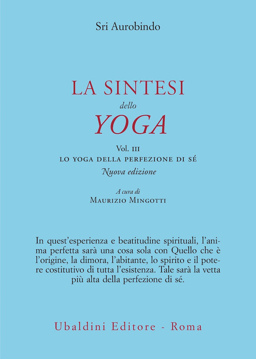 In occasione del 150° anniversario della nascita di Sri Aurobindo vede la luce una nuova traduzione in tre volumi del suo capolavoro, condotta sull'ultima edizione inglese delle opere complete, "Collected Works of Sri Aurobindo (CWSA)". Grazie al lavoro degli archivisti dell'Ashram di Pondicherry, molti refusi sono stati corretti e varie revisioni autografe ritrovate tra i manoscritti sono state vagliate e incorporate, finché si è giunti a un testo critico che può considerarsi definitivo. Questo terzo e ultimo volume della nuova edizione contiene la quarta parte dell'opera, intitolata Lo yoga della perfezione di sé. Mentre nelle prime tre parti Sri Aurobindo ripercorre ed espande in senso integrale il tradizionale trimârga o triplice sentiero dello yoga (karma yoga, jñâna yoga, bhakti yoga), qui dichiara fin dall'inizio di voler esaminare la "trasformazione della natura umana a immagine della natura divina", di volere cioè esplorare un terreno di evoluzione e trasformazione generalmente ignorato dagli yoga tradizionali. "L'intera umanità pensante", scrive Aurobindo, "è concorde sul fatto che l'essere umano è capace di evolversi e, se non altro, di avvicinarsi a una norma di perfezione ideale che la sua mente è in grado di concepire, di proporsi e di perseguire, anche se solo una minoranza sembra interessarsi a una tale possibilità come all'unico e più importante scopo della vita". Lo yoga della perfezione integrale considera l'essere umano come un essere spirituale e divino involuto nella mente, nella vita e nel corpo; mira pertanto a liberare e a rendere perfetta la sua natura divina. L'apertura e l'unione con il Divino sovracosmico e universale sono condizioni essenziali di questa perfezione integrale, e comportano il conseguimento dell'unione con la mente universale, la forma universale e la vita universale, che sono i termini costanti dell'esistenza, con l'individuo quale canale dell'anima e suo strumento naturale.