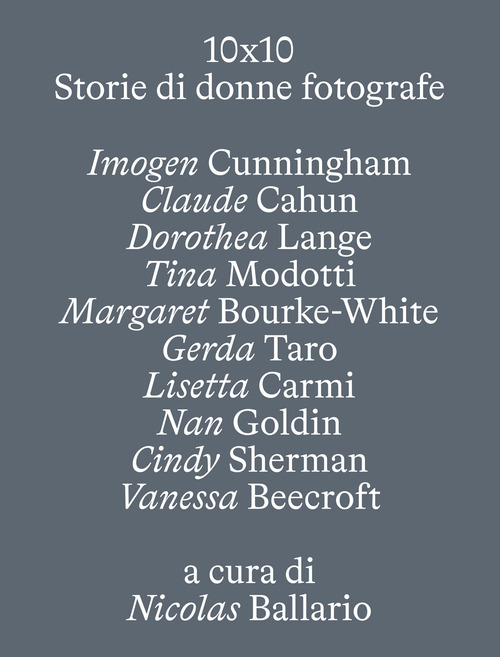 Dal successo della serie video, le vicende di 10 donne che hanno cambiato la storia della fotografia. A partire da un gruppo attentamente selezionato delle loro più fortunate e celebri immagini, impresse negli occhi e nelle emozioni di tutti noi, il libro racconta lo scorrere delle vicende delle grandi pioniere della fotografia del '900: da Dorothea Lange con i suoi scatti sull'America prostrata dalla Grande Depressione a Gerda Taro con la sua tragica, prematura fine nella guerra di Spagna, da Margaret Bourke-White, tra i primi fotografi a mettere piede nel lager di Buchenwald, a Claude Cahun, la cui opera è genialmente anticipatrice di tematiche dei nostri giorni come quelle legate al gender e all'identità sessuale. Vi sono poi autrici dedite a una propria originale ricerca, come Tina Modotti, divisa tra arte e impegno politico, e la versatile Imogen Cunningham, fino ad arrivare ai giorni nostri, con grandi artiste come Cindy Sherman e Vanessa Beecroft, che utilizzano la fotografia come medium privilegiato (per la Sherman esclusivo) di espressione del proprio mondo interiore e della propria ricerca espressiva.
