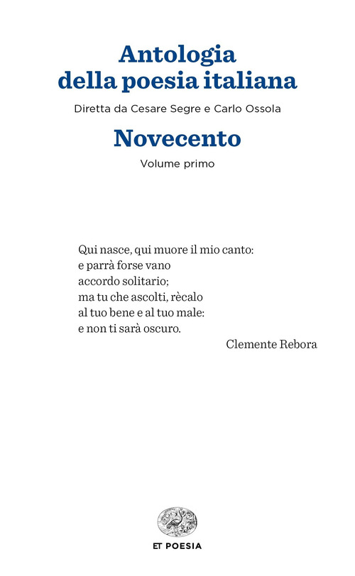 Tomo primo: Gozzano, i Crepuscolari, Lucini, Palazzeschi, Marinetti e il Futurismo, Rebora, Boine, Jahier, Campana, Sbarbaro, Onofri, Cardarelli, Saba, Ungaretti, Montale, Quasimodo, Penna, Pavese, Gatto, Sinisgalli, Betocchi, Bertolucci, Sereni, A. Pozzi, Caproni, Parronchi, Bigongiari. Tomo secondo: Luzi, Poesia in dialetto, Fortini, P. Levi, Pasolini, Orelli, Sinigaglia, Erba, A. Rosselli, Pagliarani, Sanguineti, Zanzotto, Giudici. Note filologiche e bio-bibliografiche, indice alfabetico degli autori, indice alfabetico delle opere, dei titoli e degli incipit.