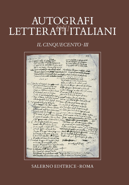 Con questo terzo volume si completa la serie relativa al Cinquecento del repertorio degli Autografi dei letterati italiani. Frutto di un lavoro pluriennale da parte di molti studiosi, il volume offre 28 schede relative ad altrettanti autori di rilievo della letteratura italiana del Rinascimento. Ciascuna scheda, secondo quella che è l'impostazione dell'intero progetto, offre una breve presentazione in forma discorsiva e un censimento analitico di tutti i manoscritti autografi e di tutti i volumi postillati di ciascun autore; a questi dati vengono accostate alcune tavole con riproduzioni degli esempi della scrittura, per favorire in futuro ulteriori ricerche e attribuzioni. In questo terzo volume, in particolare, meritano di essere sottolineate le schede relative a Leonardo da Vinci, a Ludovico Ariosto, a Giovanni Della Casa, a Torquato Tasso, schede molto ampie che offrono una storia della tradizione delle opere per questi autori, e che insieme approfondiscono alcuni dei manoscritti più celebri del Rinascimento, dai codici di Leonardo ai frammenti autografi di Ariosto e Tasso.