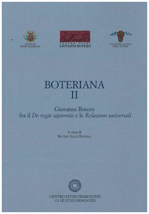 Il volume riunisce i contributi al convegno tenutosi a Bene Vagienna: Stefano Andretta, Botero tra visione e realtà del conflitto politico e religioso di fine secolo; Marzia Giuliani, Da Milano all'Europa. Giovanni Botero, Carlo Borromeo e gli Epistolarum Libri Duo; Paolo Cozzo, Il De regia sapientia, un itinerario fra politica e religione; Maria Pia Paoli, Tra splendore e regalità celesti: a proposito di Francesco de' Vieri e Giovanni Botero; Blythe Alice Raviola, Consigli per il principe: exempla e idea di monarchia fra il De regia sapientia e Le relazioni universali; Chiara Silvagni, Il ruolo della Provvidenza nelle opere giovanili di Botero: dai precetti della regia sapientia alle vestigia divine delle imprese oltreoceano.