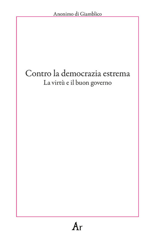 "Contro la democrazia estrema. La virtù e il buon governo" - il secondo titolo è stato scelto dal curatore per una estesa citazione di autore ignoto contenuta nel capitolo XX del Protrettico del neoplatonico Giamblico - è un testo di lotta contro quel processo espansivo della democrazia ateniese che, cominciato con la strategia di Pericle, viene continuato con i demagoghi dell'ultimo ventennio del V secolo a.e.v. Manifesto dell'aspirazione al ritorno alla "costituzione degli antenati", all'ordinamento politico pre-pericleo, lo scritto dell'Anonimo anticipa le critiche filosofiche della democrazia che, nel corso del IV secolo a.e.v., svilupperanno Platone e Aristotele.
