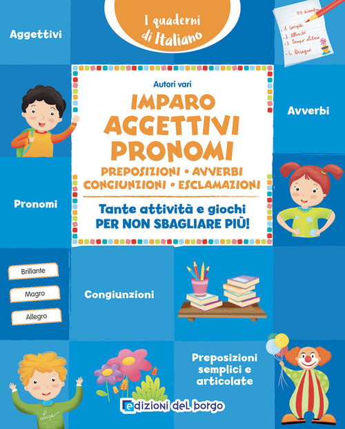 Come si riconosce un aggettivo da un pronome? Quali tipi di avverbi esistono? Cosa introducono le preposizioni semplici? Questo quaderno ha lo scopo di risolvere in maniera definitiva i dubbi più comuni che la lingua italiana pone ai bambini che frequentano la scuola primaria. Le attività, infatti, mirano a rafforzare le conoscenze sull'uso corretto degli aggettivi, dei pronomi, delle preposizioni, degli avverbi, delle congiunzioni e delle esclamazioni attraverso esercizi e giochi, un'esposizione chiara ed efficace e suggerimenti per memorizzare regole ed eccezioni. Un libro per non sbagliare più!