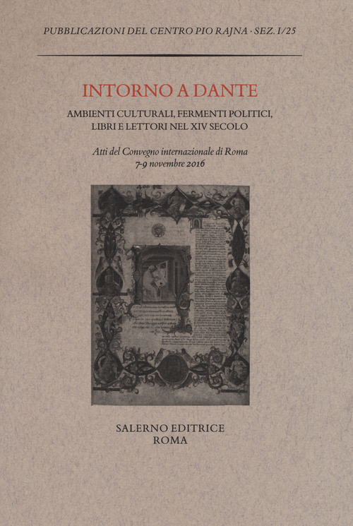 Dopo il grande convegno-evento dell'ottobre 2015, dedicato a "Dante fra il settecentocinquantenario della nascita (2015) e il settecentenario della morte (2021)", con le connesse celebrazioni in Senato e il forum del maggio dello stesso anno, si è tornati a una dimensione più consueta con il convegno del 7-9 novembre 2016, dedicato alla produzione letteraria che si attivò "Intorno a Dante", coinvolgendo direttamente il poeta o subendone in qualche modo l'influenza. Il convegno si è proposto infatti di illuminare la figura e l'opera di Dante attraverso una estesa indagine sugli ambiti politici, storici e culturali entro i quali egli fu attivo e che ne ereditarono il magistero. Giovandosi dell'apporto di metodologie e discipline scientifiche differenti, si è inteso focalizzare l'attenzione sugli ambienti che, durante la vita di Dante e subito dopo la sua morte, si segnalano quali luoghi significativi di elaborazione di cultura e di pensiero, di circolazione di libri e idee, di forme letterarie nuove, che si comprendono pienamente solo in rapporto alla "lezione" del poeta. Entro questo quadro ampio e articolato, che tratteggia le linee fondamentali della civiltà italiana durante il sec. XIV, trova un suo spazio specifico anche la prima ricezione della Commedia, testimoniata da una notevole produzione di copie manoscritte, dalla tradizione dell'antica esegesi, anche figurata, dal fiorire di una ricca e variegata aneddotica, nonché da un importante episodio "iconografico": la recente riscoperta del prezioso Libro d'ore di Francesco da Barberino, creduto fino a non molti anni fa irrimediabilmente perduto, poi ritrovato e recentemente riprodotto in facsimile: il famoso Officiolo, miniato sotto l'attenta supervisione di Francesco, che sembra con ogni probabilità testimoniare la conoscenza non superficiale da parte del Barberino almeno dell'Inferno, di cui riecheggia talune particolarità (ad esempio la raffigurazione del Limbo). Ne risulta un volume particolarmente ricco di indicazioni e di spunti, che ben si colloca all'interno delle numerose iniziative mirate a segnare il cammino verso il traguardo del settimo centenario della morte di Dante, che si celebrerà nell'ormai prossimo anno 2021.