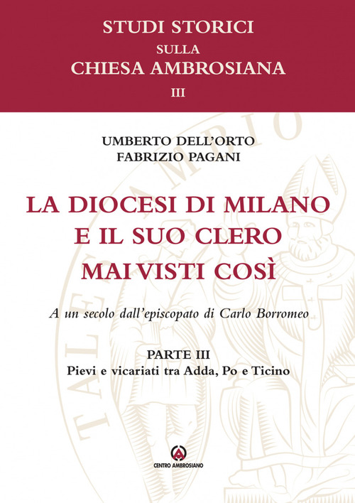 L'Archivio storico della diocesi di Milano, che trasmette le ricchezze del suo patrimonio con saggi e articoli pubblicati nella rivista annuale «Ricerche storiche sulla Chiesa ambrosiana», prosegue la collana parallela «Studi storici sulla Chiesa ambrosiana» con questo terzo volume, firmato Umberto Dell'Orto e Fabrizio Pagani, dedicato all'analisi della diocesi di Milano e del suo clero un secolo dopo la scomparsa di Carlo Borromeo. Lo sguardo sulla diocesi di Milano, si era posata, nel primo e nel secondo volume di quest'opera, sulle zone a occidente e nel settentrione lacuale e prealpino, sull'area briantea, per portarsi poi sul lecchese; quindi ridiscende in Brianza e, dopo aver lambito la città con le limitrofe pievi occidentali, ferma la propria attenzione sulla stessa Milano. In questo terzo volume della serie sono presentate le restanti parrocchie delle regioni ecclesiastiche I e V e tutte quelle della regione VI, dall'oriente all'occidente del territorio diocesano, cioè dall'Adda al Ticino, passando per la Bassa milanese fino a toccare il Po. Il volume si completa con un fascicolo, per la prima volta in assoluto, raccoglie le mappe delle parrocchie della diocesi di Milano a un secolo dall'episcopato di Carlo Borromeo.