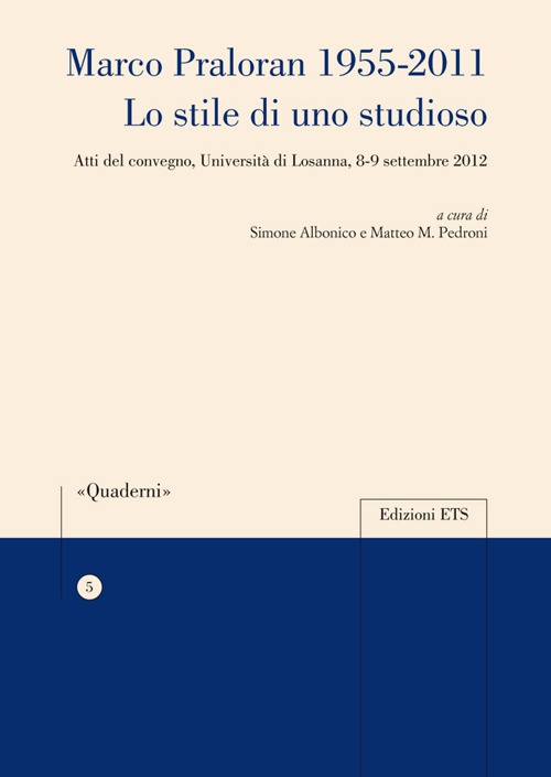 Gli interessi di Marco Praloran (1955-2011), dentro e fuori gli studi, erano quanto mai vari, vasti e ben radicati, ma le motivazioni più profonde che lo muovevano parrebbero riconducibili a un nucleo molto compatto. In virtù di questa vocazione Marco Praloran ha potuto rinnovare la ricerca in campi di grande rilevanza (il poema cavalleresco, gli studi metrici, Petrarca) e mantenersi fedele ad alcuni temi e interessi di fondo, e ad uno in particolare che tutti li riassume, e che apoditticamente si può ridurre al problema del tempo: in un'accezione ampia e articolata, che abbraccia i tempi delle narrazioni antiche in versi e quelli dei romanzi moderni in prosa, i tempi interni ai canti, alle ottave, a singoli testi o a gruppi di testi lirici, ai versi, e poi giù fino alle sillabe e ai suoni, con il desiderio evidente, in particolare nel caso di Boiardo (l'autore che forse ha più amato), di stringere molti elementi e restituirli poi in una appassionata e concertata visione d'insieme: quasi si trattasse di leggere e interpretare per la prima volta una partitura trascurata, ritrovare le ragioni di un'intonazione o il gusto di una cadenza, mettere a punto un gesto esecutivo e restituire il respiro dovuto alle singole battute. Tempo, ritmo, misura, eleganza del gesto, inoltre, non solo erano qualità della sua conversazione, del suo carattere e del suo tratto, ma si ritrovano anche sullo sfondo delle sue altre grandi passioni, la musica, per l'appunto, e gli sport.