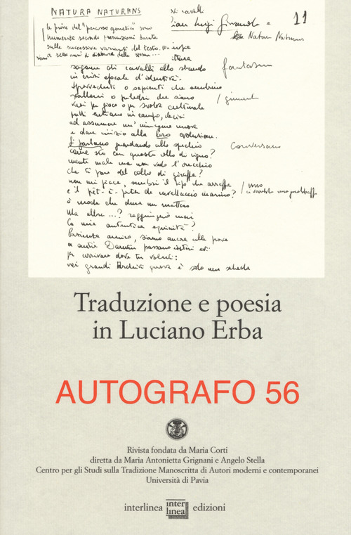 Il numero offre un ritratto di Luciano Erba, poeta, francesista e traduttore, muovendo dall'archivio affidato al Centro Manoscritti di Pavia. Le carte e i documenti, descritti nella Vetrina da Federico Milone, illuminano la storia interna ed esterna del suo lavoro: lo mostrano i contributi critici dello stesso Milone sulla genesi del Prato più verde (1977) e di Samuele Fioravanti sulla raccolta L'ippopotamo (1989), cui si affianca il saggio di Anna Stella Poli sulle traduzioni. Roberto Cicala, Arnaldo Di Benedetto ed Emilio Isgrò, nell'Archivio della memoria, tracciano segmenti complementari di un ritratto dell'intellettuale e del poeta, attraverso schegge di vita privata e riflessioni critiche. Dal ricco corpus epistolare di poeti, amici, critici ed editori, vengono proposte, a cura di Annamaria Azzarone, ventidue lettere inedite di Gianfranco Contini, segnate dalla consueta vivacità linguistica del mittente, ricca di allusioni culturali e no, testimonianza del legame di stima e amicizia tra il critico e il poeta.