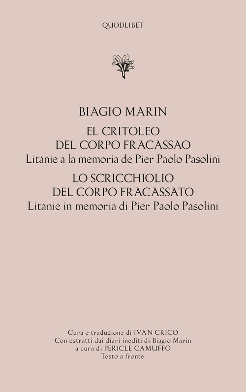 Il 6 novembre, giorno dei funerali di Pasolini a Casarsa, Marin annota nel suo diario: «Or ora ho scritto alcuni miei poveri versi, per tentare di liberarmi dalla pena che ho in cuore, provocatami dall'episodio della sua morte, dal modo della sua fine. Quel diciassettenne che non si è accontentato all'abbatterlo, ma passa con l'automobile sul suo corpo ancora vivo, per finirlo del tutto, e lo schiocca e l'uccide, chi era? Che cosa era?». I «poveri versi» in questione sono uno dei vertici della poesia dialettale del Novecento: El critoleo del corpo fracassao, che qui si pubblica accompagnato per la prima volta dalla traduzione italiana di Ivan Crico. In tredici densi, luminosi componimenti in quartine rimate, la memoria del poeta assassinato viene restituita al dolce paesaggio della terra friulana e lo scricchiolio del corpo fracassato si ripercuote nel ritmo cadenzato di una indimenticabile litania, dove «il mio canto col tuo si confonde /... il mare è uno, con le sue tante onde».
