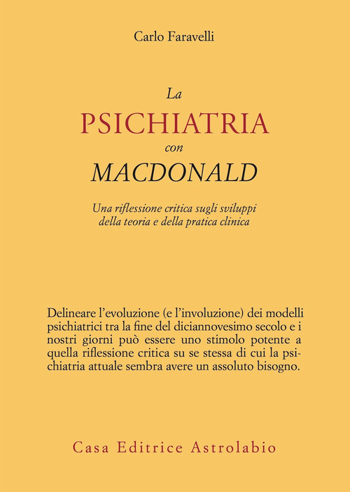 L'autore ha attraversato nella sua lunga attività clinica, di ricerca e di didattica un periodo di repentine trasformazioni dei concetti e delle pratiche psichiatriche che ha configurato un'autentica rivoluzione di tutti i parametri clinici e teorici della disciplina. È stato uno degli ultimi psichiatri a essersi formato sulla psichiatria precedente il DSM-III, ha potuto lavorare fianco a fianco con colleghi più? anziani che avevano vissuto in prima persona l'ingresso degli psicofarmaci nei manicomi e osservato i mutamenti che ne erano derivati, ha conosciuto il lavoro nei manicomi prima della legge 180, ha interagito in prima persona con gli esponenti più? rappresentativi della psichiatria mondiale, ed è stato professionalmente presente e attivo in tutti i sostanziali cambiamenti della disciplina degli ultimi cinquant'anni. Proprio nell'attività dell'insegnamento per la specializzazione ha constatato con sorpresa che i giovani colleghi di recentissima formazione sembravano vivere una psichiatria dell'oggi senza alcun riferimento allo ieri, una destoricizzazione totale, in cui le nozioni e le convenzioni odierne venivano accettate senza alcun tentativo di approfondimento critico, o almeno di inquadramento storico. Ha avvertito dunque la necessità di tramandare un po' della sua esperienza per non lasciar cadere il divenire della materia psichiatrica nell'oblio totale, e per far sì che i giovani psichiatri non perdano le radici della professione e le usino per riflettere in misura più critica sulla loro pratica. Il fulcro di questa complessa storia evolutiva della psichiatria è il passaggio epocale da una tradizione di medici-filosofi finissimi osservatori e narratori, ma lontani dall'uniformità clinica e diagnostica, a una psichiatria fatta di crocette sui questionari, ben stabilita, riproducibile, facilmente accessibile e comprensibile, ma straordinariamente povera di costrutti epistemologici, oltre che di profondità psicopatologica. Nel mezzo, come elemento unificante, vero artefice di entrambi i cambiamenti, l'ingresso sempre più massiccio del mercato, dell'interesse economico, teso ad allargare quanto più possibile il plateau dei fruitori di qualsiasi prodotto commercializzabile. Questa la traccia di una narrazione tanto avvincente quanto precisa, tanto vissuta personalmente quanto rigorosamente oggettiva. E Macdonald? (o, forse, McDonald?) Il lettore lo scoprirà ben presto, sin dalle prime pagine.