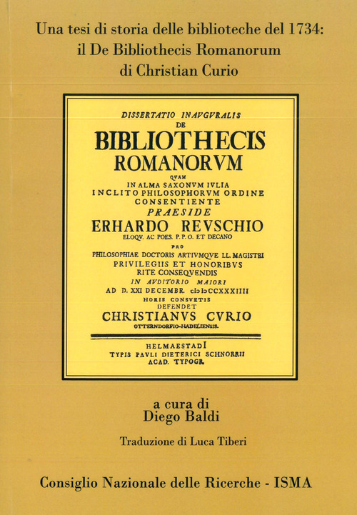 Il "De Bibliothecis Romanorum" di Christian Curio, apparso nel 1734, è una delle prime tesi accademiche di storia delle biblioteche. Ne è qui riproposta l'edizione moderna corredata di saggio introduttivo, traduzione e commento critico.