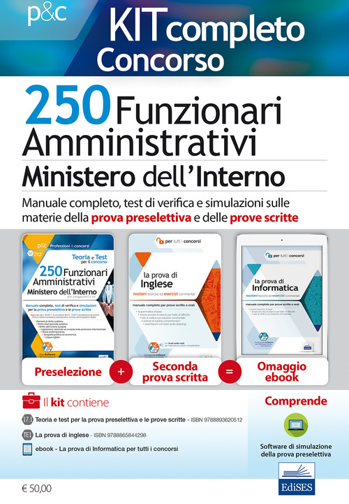 Il kit completo per la preparazione a tutte le fasi del concorso comprende i seguenti volumi: 1) 250 Funzionari Amministrativi. Teoria e test per la preselezione e le prove scritte (Elementi di diritto pubblico, Diritto internazionale pubblico, Diritto dell'Unione europea, Legislazione nazionale ed europea sulla protezione internazionale, Storia contemporanea, Geografia politica ed economica, Inglese); 2) La prova di inglese (Con esercizi di reading, writing e brani audio per esercitarsi nel listening). In omaggio con il kit: Software di simulazione per effettuare infinite simulazioni + versione ebook del volume. La prova di informatica per tutti i concorsi.