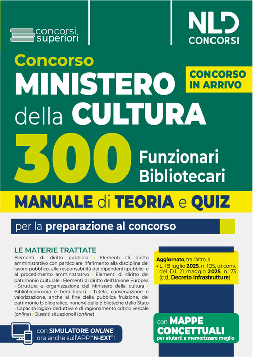 Il "Manuale Ministero della Cultura, 300 Funzionari Bibliotecari, teoria e quiz" NLD Concorsi 2025 è stato realizzato per supportare chi intende iniziare tempestivamente a prepararsi per le prove dell'importantissimo Concorso inattesa dell'imminente pubblicazione del bando. Il volume si caratterizza per una trattazione completa, aggiornata e, al contempo, schematica e fluida delle materie più probabili: Elementi di diritto pubblico; elementi di diritto amministrativo con particolare riferimento alla disciplina del lavoro pubblico, alle responsabilità dei dipendenti pubblici e al procedimento amministrativo; Elementi di diritto del patrimonio culturale; Elementi di diritto dell'Unione Europea; Struttura e organizzazione del Ministero della cultura; Biblioteconomia ebeni librari; Tutela, conservazione e valorizzazione, anche al fine della pubblica fruizione, del patrimonio bibliografico, nonché delle biblioteche dello Stato; Capacità logico-deduttiva e di ragionamento critico verbale (online); Quesiti situazionali (online). Il Volume tiene conto delle più recenti novità legislative, tra cui quelle introdotte dalla L. 18 luglio 2025, n. 105, di conv. del D.l. 21 maggio 2025, n. 73 (c.d. Decreto Infrastrutture), dalla L. 8 giugno 2025, n. 80 di conv. del D.L. 11 aprile 2025, n. 48 (c.d. Decreto Sicurezza) e dalla L. 9 maggio 2025, n.69, di conv. del 14 marzo 2025, n. 25 (Decreto P.A.). Per consentire di affiancare allo studio teorico una immediata verifica della acquisita capacità di risolvere i corrispondenti test, il Manuale presenta quiz di verifica suddivisi per ciascuna Parte o per singoli Capitoli che compongono le indicate materie. Il Manuale permette, infine, l'accesso ad un'estensione online, consultabile con apposita password, per rimanere aggiornati sulle materie oggetto d'esame, per accedere alle mappe concettuali e per esercitarsi con il simulatore online.