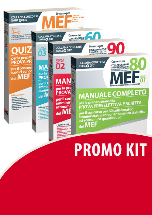 Kit: 3 manuali e 1 volume quiz. 1 per collaboratore amministrativo con orientamento statistico ed economico quantitativo (Codice concorso 01), 1 per collaboratori amministrativi con orientamento economico aziendale e contabile (Codice concorso 02), 1 per collaboratori amministrativi con orientamento economico finanziario (Codice concorso 03), 1 volume Quiz.