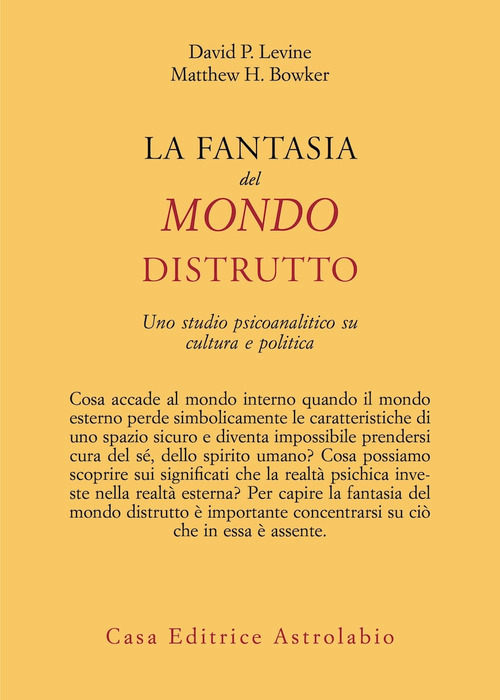 Le fantasie esistono a due livelli di esperienza: il mondo interno, o privato, e lo spazio esterno, pubblico. Una fantasia pubblica è condivisa, ci tiene insieme agli altri e rivela il senso del nostro legame sociale, che a sua volta definisce il tipo di società in cui viviamo, o vorremmo vivere. In questo volume Levine e Bowker analizzano la fantasia del mondo distrutto e le tendenze culturali e politiche che si organizzano intorno all'idea che il mondo nel quale viviamo sia un posto pericoloso, dominato da odio e distruzione, nel quale il compito principale del soggetto sia sopravvivere e lottare contro forze ostili. L'approfondimento di questa fantasia pubblica ne rivela i significati nascosti e i risvolti nei riguardi del mondo interno, nonché delle difese fondate sul concetto di colpa, funzionale a garantire la possibilità di un'azione riparatrice del mondo distrutto. La convinzione di essere alla mercé di minacce esistenziali si esprime attraverso narrazioni, immagini e dialoghi investiti da desiderio e paura. In queste fantasie il passato, il presente e il futuro sono tempi di scontro della volontà, e i personaggi che compaiono nella fantasia privata, ma soprattutto in quella pubblica, incarnano le esperienze emotive interiorizzate come stati del sé. Tali fantasie, che tendono a formare narrazioni estreme e pervase di violenza, non inducono il soggetto che le produce ad agire quella stessa violenza, ma influiscono sul modo in cui l'individuo modella il mondo esterno. La fantasia pubblica quindi non è solo una fuga dalla realtà, è il segnale che nella vita privata di ciascuno si manifesta un elemento vitale di condivisione con l'altro. Attingendo a un vasto orizzonte psicoanalitico, che da Freud e dal suo concetto di uso della colpa come base della società passa per la perdita del kleiniano 'oggetto buono' e per il 'difetto fondamentale' di Balint, Levine e Bowker accompagnano il lettore in un viaggio nella fantasia del mondo distrutto e nei suoi risvolti sociali e politici, servendosi di esempi tratti dalla letteratura del Novecento, dalle serie televisive e da fatti di cronaca accaduti nel recente passato.