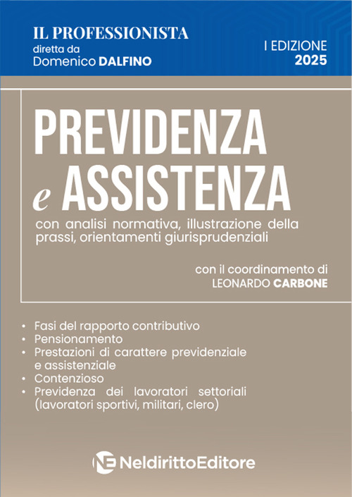 Il Volume "Previdenza e Assistenza", Neldiritto Editore 2025, offre una panoramica completa, dettagliata e aggiornata delle molteplici tematiche legate alla previdenza e all'assistenza, incluse quelle relative al contenzioso. Attraverso la guida di esperti del settore, l'Opera offre informazioni puntuali su ogni aspetto contributivo, assicurativo e prestazionale, mediante l'analisi della normativa specifica, l'illustrazione della prassi amministrativa e la segnalazione degli orientamenti giurisprudenziali più rilevanti. Con focus di approfondimento, anche su aspetti settoriali e poco inflazionati come la previdenza dei lavoratori sportivi, degli agenti di commercio, del clero e dei militari, il Volume si propone come un valido strumento pratico per professionisti, operatori del diritto e più in generale, per quanti intendono approcciarsi ad una materia complessa, quale è quella del diritto alla previdenza e all'assistenza, caratterizzata da una plurisecolare stratificazione normativa e da interpretazioni giurisprudenziali non sempre uniformi. L'Opera, composta in tutto da trentasei capitoli, esamina le diverse fasi del rapporto contributivo, dall'insorgenza dell'obbligo alla contribuzione, dal pensionamento alle varie prestazioni di carattere previdenziale e assistenziale fino al contenzioso. Per agevolare la consultazione, il Volume utilizza una precisa simbologia: per segnalare i riferimenti giurisprudenziali relativi alla questione trattata nel paragrafo, offrendo un immediato richiamo alle pronunce più rilevanti; per evidenziare suggerimenti pratici, riflessioni operative o questioni di particolare rilievo.
