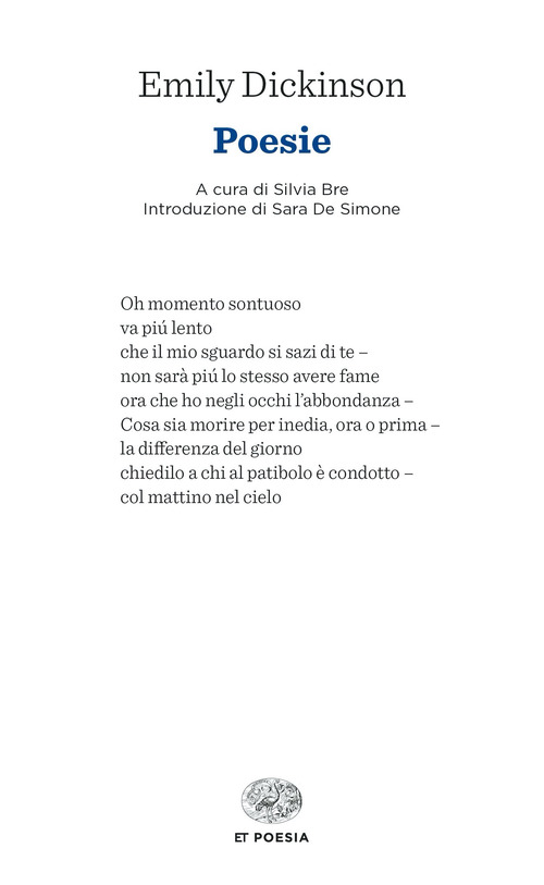 In un unico volume oltre 350 poesie della più importante poetessa americana del XIX secolo, che la traduzione di Silvia Bre restituisce in tutta la loro tellurica potenza. «Ogni raccolta di poesie di Emily Dickinson, come un frattale, è di per sé un trattato sulla parola: un trattato, beninteso, per immagini. Lei insegna meglio di ogni altro poeta che la parola, sacra in quanto esile, è un puro velo che la lettura taglia come fosse una tela di Fontana, per andare verso il suo rovescio, l'immagine sconfinata che la lingua poetica proietta per sempre in tutte le direzioni e che si offre come esperienza universale» (Silvia Bre). Introduzione di Sara De Simone.