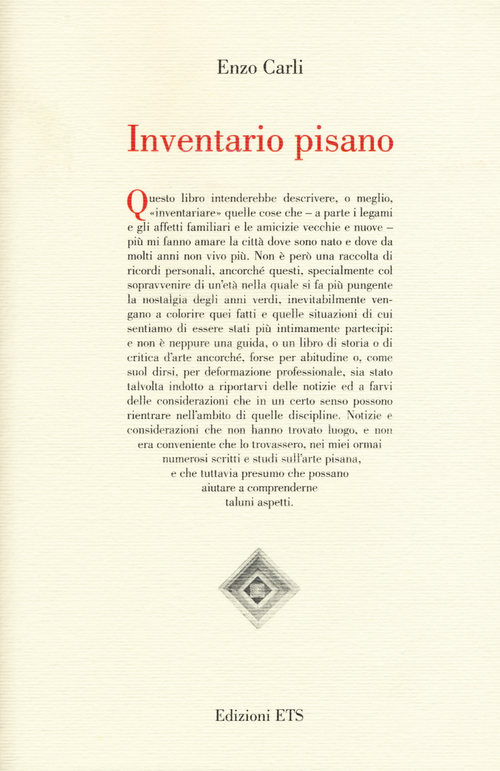 Questo libro intenderebbe descrivere, o meglio, "inventariare" quelle cose che, a parte i legami e gli affetti familiari e le amicizie vecchie e nuove, più mi fanno amare la città dove sono nato e dove da molti anni non vivo più. Non è però una raccolta di ricordi personali, ancorché questi, specialmente col sopravvenire di un'età nella quale si fa più pungente la nostalgia degli anni verdi, inevitabilmente vengano a colorire quei fatti e quelle situazioni di cui sentiamo di essere stati più intimamente partecipi: e non è neppure una guida, o un libro di storia o di critica d'arte ancorché, forse per abitudine o, come suol dirsi, per deformazione professionale, sia stato talvolta indotto a riportarvi delle notizie ed a farvi delle considerazioni che in un certo senso possono rientrare nell'ambito di quelle discipline. Notizie e considerazioni che non hanno trovato luogo, e non era conveniente che lo trovassero, nei miei ormai numerosi scritti e studi sull'arte pisana, e che tuttavia presumo che possano aiutare a comprenderne taluni aspetti. Con scritti di: Fortunato Bellonzi, Stefano Bruni, Ranieri Carli, Lucia Tongiorgi Tomasi.
