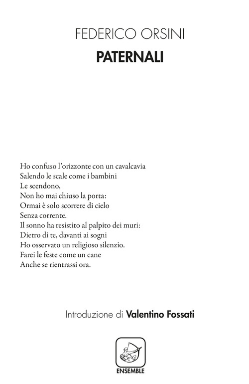 La poesia di Federico Orsini presenta talvolta una scrittura più "piana", a grado zero, ma sembra in altre zone come accendersi. Accenti visionari, metafore e violente analogie, contraddistinte pure da quel "contenere", da un prematuro ritirarsi della vita; da una giovinezza che è sì forza di poesia, ma anche ferita, distacco definitivo. Non è l'assenza del padre come abbandono, tradimento, rifiuto. È assenza dei padri una volta che si sono vissuti pienamente, amati e perduti prematuramente, definitivamente. Un vuoto dispiegato nel tempo fino al suo limite, che non può conoscere "generazione" e tantomeno età anagrafica.