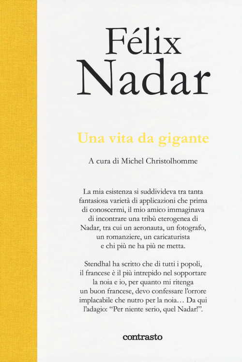 Grande fotografo ma anche sperimentatore, attivista politico, giornalista impegnato, caustico caricaturista, inventore di nuove tecniche fotografiche e pioniere del volo: Nadar è stato tutto questo e accanto ai suoi celebri ritratti, da Sarah Bernhardt a Gioacchino Rossini, da Victor Hugo a Jules Verne, di lui ci rimangono anche le straordinarie narrazioni. "Una vita da gigante" raccoglie oltre cento immagini, accompagnate da una scelta ragionata dei suoi testi, che ci restituiscono il ritratto di un uomo e un artista eccezionale, avventuroso, curioso, geniale, e insieme il vivido affresco della Francia del XIX secolo.
