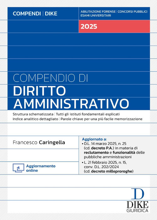 Il Compendio di Diritto Amministrativo 2025 è uno degli ultimi testi della collana Compendi di Dike Giuridica che: offrono un'esposizione sistematica, in forma chiara e sintetica, di tutti gli istituti presentano una trattazione completa, attenta a tutti gli argomenti sensibili per le prove d'esame permettono una rapida memorizzazione attraverso mirate tecniche di paragrafazione e l'evidenziazione in grassetto dei concetti-chiave propongono un percorso lineare, completo e approfondito analizzano la materia in modo semplice ed esaustivo sono sempre aggiornati all'ultimo dato normativo espongono i principali orientamenti di dottrina e giurisprudenza sono dotati di un utilissimo indice analitico che consente una rapida individuazione delle tematiche di studio La collana è uno strumento operativo indispensabile per coloro che si preparano all'esame di avvocato, per gli studenti universitari, per i candidati ai concorsi pubblici. Il presente Compendio di Diritto Amministrativo è particolarmente indicato per la preparazione alla prova orale dell'esame di Avvocato 2025.