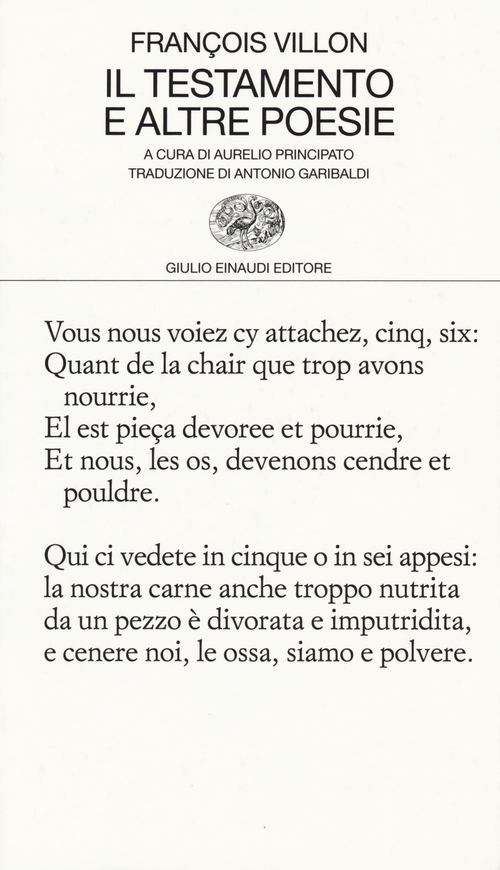 Universalmente considerato come uno dei più grandi poeti di tutti i tempi, Villon è stato spesso interpretato dai critici e dai traduttori come un poeta maledetto, antesignano degli eroi romantici. Oggi sappiamo che Villon non era affatto un poeta ingenuo e istintivo, che padroneggiava straordinariamente gli strumenti tecnici e retorici della poesia del suo tempo. Però è pur vero che la sua opera contiene in sé un germe di deviazione e di provocazione che va al di là dei generi letterari codificati a cui appartiene. E questo germe ha continuato a svilupparsi nei secoli, fino ai rapper di oggi, come azzarda suggestivamente Aurelio Principato nella sua introduzione, facendo di Villon l'archetipo di una "funzione" poetica che ha attraversato e segnato la storia della cultura occidentale. In questa nuova edizione delle sue poesie più importanti la traduzione è condotta in versi, recuperando il più possibile anche le rime e il tessuto sonoro dei testi. La scommessa è reinterpretare fedelmente Villon restituendone anche la forza ritmica che permette alle sue parole di risuonare fino a noi, e oltre.
