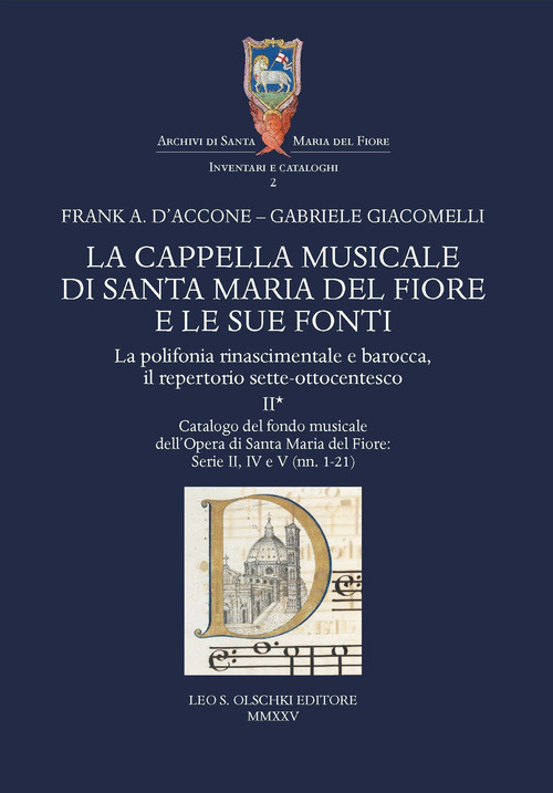 Catalogo del fondo musicale dell'Archivio dell'Opera di Santa Maria del Fiore relativamente alle sezioni di polifonia rinascimentale-barocca e al repertorio del XVIII e XIX secolo. Il primo volume, suddiviso in due saggi, illustra la storia della cappella musicale del Duomo di Firenze e del suo patrimonio librario dal XV al XIX secolo. Il secondo volume contiene la schedatura analitica dei singoli manoscritti e libri a stampa che costituiscono il fondo. Il catalogo è corredato da una serie di indici che ne agevolano la consultazione.