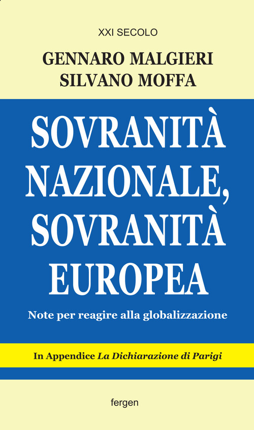 La sovranità accende il dibattito all'interno della crisi della globalizzazione finanziaria e politica. Dalla dissoluzione di quella che sembrava la panacea di tutti mali, soltanto una ventina d'anni fa, è scaturita una reazione da parte di popoli, forze politiche, intellettuali che contestano il dominio del "pensiero unico" a fondamento del liberismo mondialista che letteralmente sta annientando culture e identità. Gennaro Malgieri e Silvano Moffa propongono in questo libro delle note come contributo alla discussione sulla sovranità, un tema che appartiene e sostanzia tutte le aggregazioni politicamente rilevanti. Sulla sovranità, com'è noto, si è esercitato a lungo il pensiero politico europeo nel tentare di dare una definizione che, a conti fatti, non sempre è risultata univoca. Oggi si pone un problema che va oltre quell'intento, vale a dire la ricerca della declinazione della sovranità nelle sue molteplici manifestazioni e non più soltanto come la difesa dei confini nazionali. In appendice viene pubblicato il manifesto degli intellettuali conservatori europei, elaborato a Parigi nel 2007 sui caratteri della "vera Europa".