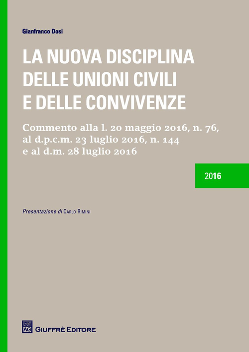 Con la legge 20 maggio 2016, n. 76, a cui hanno fatto seguito le norme transitorie quali il D.p.c.m. 23 luglio 2016, n. 144, riguardanti disposizioni per la tenuta dei registri nell'archivio dello stato civile, e il D.m. Interno 28 luglio 2016, relativo alle formule per gli adempimenti degli ufficiali di stato civile in materia di unioni civili, l'Italia ha finalmente una normativa organica sia sulle unioni civili tra persone dello stesso sesso, disciplinate come formazioni sociali in modo pressoché simmetrico a quanto previsto nell'ordinamento vigente per le coppie coniugate, sia sulle convivenze di fatto tra persone maggiorenni unite stabilmente da legami affettivi di coppia e di reciproca assistenza morale e materiale, non vincolate da rapporti di parentela, affinità o adozione, da matrimonio o da un'unione civile. Nella parte in cui disciplina le convivenze di fatto la legge interessa centinaia di migliaia di coppie e di famiglie che hanno progettato la loro vita al di fuori dei legami matrimoniali e che oggi vedono rafforzato il loro statuto giuridico rispetto a garanzie già esistenti nella legislazione o già riconosciute in passato dalla giurisprudenza. La novella non trasforma l'obbligazione naturale di solidarietà reciproca in obbligazioni giuridiche. Riconosce, però, specifici diritti di natura personale, conferma la piena autonomia negoziale, disciplina i contratti di convivenza e introduce un dovere di natura alimentare al momento della cessazione della vita in comune.