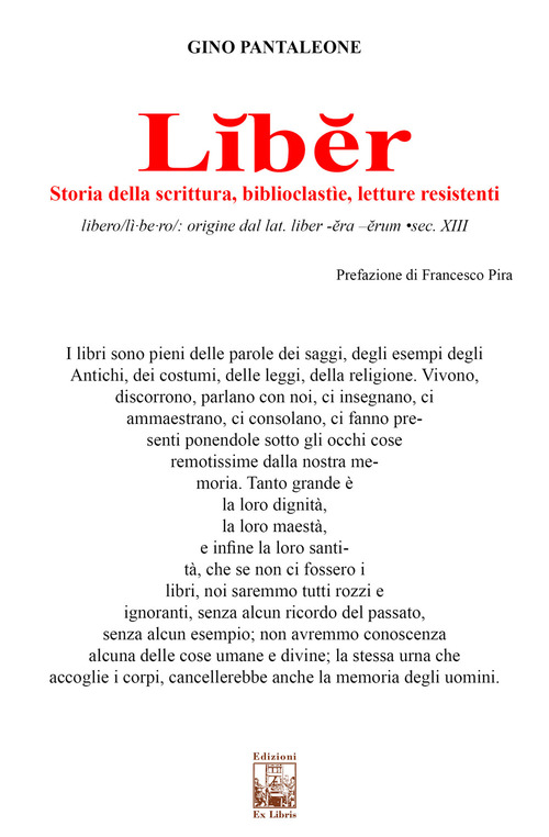 L'autore, saggista e poeta, in questo volume percorre un excursus storico e critico sulla storia e l'evoluzione del libro e di tutto ciò che lo compone, lo alimenta e, al tempo stesso lo distrugge. Il libro come bene supremo, capace di creare o modificare le conoscenze e le coscienze nell'uomo che ha popolato la terra sin dalle più remote origini. La storia della scrittura, gli strumenti e i supporti utilizzati nei secoli, i codici miniati e l'invenzione della stampa: sono questi i temi trattati nei capitoli di Liber in cui, nell'ultima sezione, l'Autore approfondisce la problematica dei libri che, rinnegati dalle istituzioni, hanno avuto il loro triste epilogo nel violento rogo purificatore. Dalla creta alla carta, da Stalin a Hitler, da Cartagine a Sarajevo, dal 1300 a.C. ad oggi: la storia del libro, della scrittura, delle biblioclastìe e delle letture resistenti in un dettagliato e illuminante "libro sui libri". La prefazione è di Francesco Pira, Sociologo e Docente presso l'Università degli Studi di Messina.