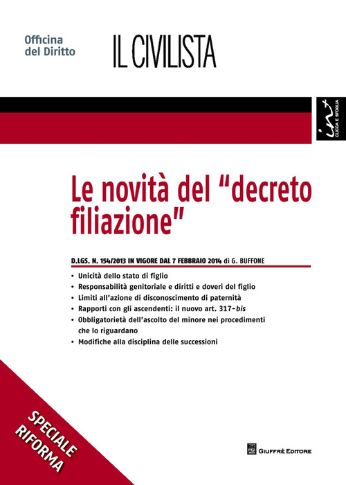 Il volume offre un quadro completo delle novità introdotte dal D.lgs. n. 154/2013 "decreto filiazione" in vigore dal 7 febbraio 2014. In particolare vengono esaminati: l'unicità dello stato di figlio; la responsabilità genitoriale e i diritti e doveri del figlio; i limiti all'azione di disconoscimento di paternità; i rapporti con gli ascendenti (il nuovo art. 317- bis); l'obbligatorietà dell'ascolto del minore nei procedimenti che lo riguardano; le modifiche alla disciplina delle successioni.