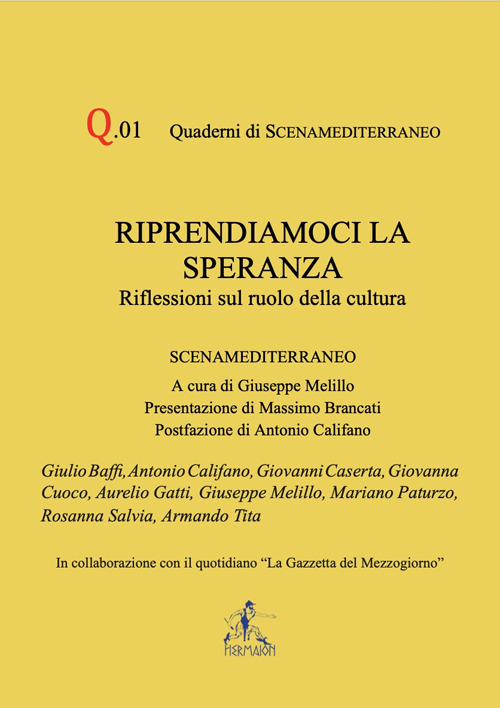Q.01 Con la rubrica Riprendiamoci la speranza, dal mese di agosto La Gazzetta ha ospitato il pensiero di intellettuali da tempo impegnati nel mondo della cultura. Si sono raccolte voci ed opinioni nel tentativo di unire idee, uomini, saperi per offrire alla Comunità nuove aree per una produzione culturale aperta ed orientata a tutto il mezzogiorno italiano e del mediterraneo. Dagli intervenuti sembra evincersi che la cultura oggi appare non essere più volta ad un progetto pubblico e civile, che aspiri - anche con un pizzico d'utopia - ad una pari opportunità di accesso alle opere dell'ingegno, in una idea di conoscenza intesa come esigenza di giustizia, e questo per mancanza di autonomia finanziaria e un rapporto distorto e strumentale con la politica e le sue istituzioni soprattutto territoriali.