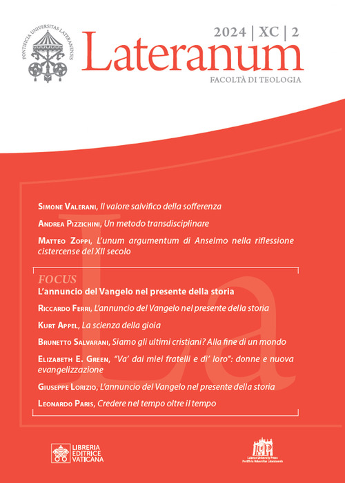 Simone Valerani, Il valore salvifico della sofferenza Andrea Pizzichini, Un metodo transdisciplinare Matteo Zoppi, L'unum argumentum di Anselmo nella riflessione cistercense del XII secolo FOCUS L'annuncio del Vangelo nel presente della storia Riccardo Ferri, L'annuncio del Vangelo nel presente della storia Kurt Appel, La scienza della gioia Brunetto Salvarani, Siamo gli ultimi cristiani? Alla fine di un mondo Elizabeth E. Green, "Va' dai miei fratelli e di' loro": donne e nuova evangelizzazione Giuseppe Lorizio, L'annuncio del Vangelo nel presente della storia Leonardo Paris, Credere nel tempo oltre il tempon