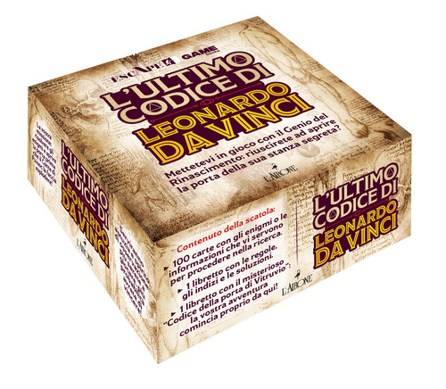 Chi scoprirà per primo i tesori del genio leonardesco nascosti dietro la misteriosa porta di Vitruvio? Il kit del gioco si compone di: 100 carte numerate divise in 7 pacchetti, con enigmi di diverso genere ma tutti legati al geniale universo leonardesco; 1 libretto di 48 pagine con le regole del gioco, i consigli su come disputare al meglio la partita e le soluzioni degli enigmi; 1 libretto con le chiavi per trovare, sulla base degli enigmi via via risolti, i codici di accesso al laboratorio (attraverso la "porta di Vitruvio"); 1 tabellone di gioco: il fondo della scatola si apre... Ed ecco pronto il campo della disputa.