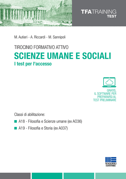 Il volume è indirizzato a quanti intendono accedere al Tirocinio Formativo Attivo per ottenere l'abilitazione all'insegnamento nelle classi: A18 Filosofia e Scienze umane (ex AO36); A19 Filosofia e Storia (ex A037). Il testo si suddivide in: una prima sezione di test volti a verificare le competenze linguistiche e la comprensione di brani (sinonimi, contrari, analogie, comprensione di testi e di tabelle, logica); questa sezione è preceduta da brevi richiami di grammatica, utili per fugare dubbi sul piano ortogrammaticale e sintattico; una seconda sezione, articolata in questionari che mirano a verificare le conoscenze sulle discipline oggetto di insegnamento della classe di concorso: Filosofia (Antica e Medievale, Moderna, Contemporanea); Storia (Antica, Medievale, Moderna, Contemporanea, Cittadinanza e Costituzione); Scienze umane (Pedagogia e didattica, Psicologia, Sociologia e Antropologia). Per ciascuna delle discipline, il volume offre una vasta gamma di domande a risposta chiusa con 4 opzioni, di tipologia analoga a quelle previste per il test preliminare. Ciascuno dei quesiti è accompagnato da ampie e accurate spiegazioni che consentono un veloce e proficuo riepilogo dei principali punti di ciascuna disciplina oggetto della prova. Sul sito moduli.maggioli.it è disponibile il software per prepararsi alla prova preselettiva ed effettuare infinite simulazioni con le modalità delle prove reali.