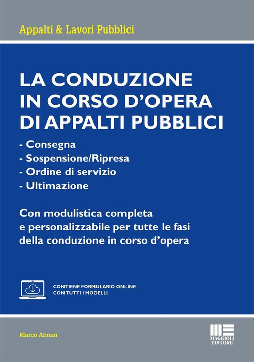 Il nuovo volume di Marco Abram rappresenta un punto di riferimento indispensabile per chi gestisce appalti pubblici, sia di lavori che di servizi e di forniture. Un manuale chiaro e approfondito, pensato per accompagnare professionisti, tecnici, RUP e direttori dei lavori in ciascuna fase principale del cantiere. Grazie a una struttura organizzata che spazia dalla consegna all'ultimazione, il libro offre indicazioni operative, riferimenti normativi aggiornati e soluzioni concrete per fronteggiare le sfide della pratica quotidiana. Inoltre, al volume è abbinata una ampia raccolta di modulistica, verbali e schemi grafici in formato digitale, verbali di consegna, verbali di sospensione e di ripresa, ordini di servizio e certificati di ultimazione; ogni documento è predisposto per essere adattato ai contesti specifici. Un supporto intelligentemente progettato per ottimizzare tempi, ridurre errori e aumentare l'efficacia comunicativa tra le parti coinvolte.