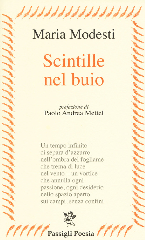"Maria Modesti con Scintille nel buio percorre con certezza e chiarezza sentieri e viottole o strade «tortuose» che la riconducono, immancabilmente, a una costante, fervida e personalissima introspezione di ricerca di spazi, dove la «luce vorticosa» o «inabissata» si acquieta con «l'ombra» che «traluce»... Si tratta di un lungo cammino dove le visioni incantate («scaglie lucenti all'orizzonte») di distese di mare e di cielo, tra boschi di querce e «crete assolate», cipressi appuntiti e fiori profumati di ginestra si incrociano con i drammi d'orrore e di violenza efferata del terrorismo, mentre nel «fragore di buio» (...) «alto si leva il silenzio»; e neppure viene taciuto il «passaggio lieve sulla terra» dei migranti che, in un «vortice di sabbia e tempesta», fuggono dalla guerra, «nel sogno e nel miraggio appena intravisto nella luce del deserto». Le pagine scorrono in un afflato lirico di ampia dimensione spirituale, confermando la disponibilità della Modesti a percorrere orizzonti intensi, illuminati dalla sua decisa propensione poetica a non rifugiarsi dietro timorosi e pudici anfratti..." (Dalla Prefazione di Paolo Andrea Mettel)