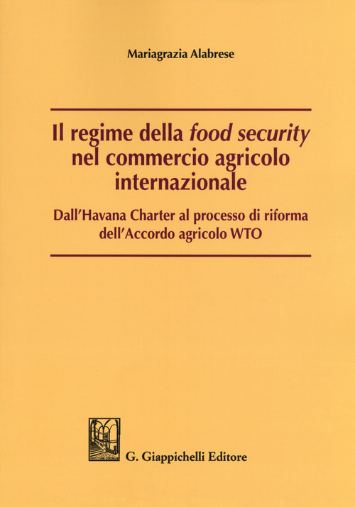 Le cause della food insecurity sono molteplici e, sebbene il commercio internazionale rappresenti solo uno dei fattori che possono influenzarla, esso, e quindi le regole che lo disciplinano, appaiono di crescente rilevanza in un sistema alimentare 'transnazionale', caratterizzato da spiccata interdipendenza. La monografia scientifica dal titolo "Il regime della food security nel commercio agricolo internazionale. Dall'Havana Charter al processo di riforma dell'Accordo agricolo WTO" è volta a determinare il regime della sicurezza alimentare che può farsi discendere dalla disciplina dell'Accordo agricolo e ad individuare quale nozione di food security emerga dal medesimo trattato e quale attenzione sia riservata al diritto al cibo in tale contesto. Il volume è destinato alla comunità scientifica interessata ai temi del diritto agrario e agroalimentare internazionale, così come alle istituzioni che operano nel settore della food security.