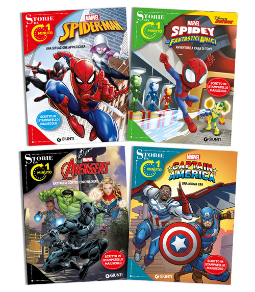 Volumi monotematici, spillati, in stampatello maiuscolo, con bassa foliazione e prezzo competitivo. I 4 titoli Marvel si aggiungono ai 9 già usciti nel 2024 nella stessa collana Storie da 1 minuto. I libri sono dedicati a Spider-man, Spidey e i suoi fantastici amici, Avengers e Captain America. Età di lettura: da 3 anni.