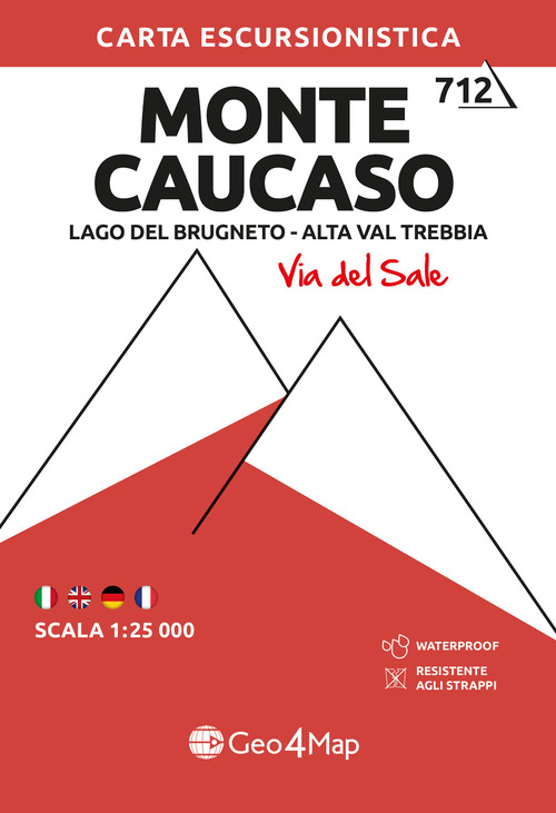 La carta escursionistica n° 712 Geo4Map di Monte Caucaso comprende anche il territorio di Lago del Brugneto e Alta Val Trebbia (via del Sale) ed è realizzata in scala 1:25.000 con un'ampia rappresentazione del territorio: formato aperto di cm. 104 x 76, formato chiuso cm 13 x 19, a colori. Stampata su carta Stone Paper, composta da polvere di pietra, è estremamente durevole, idrorepellente, anti riflesso. Le curve di livello a 20 metri, i particolari rocciosi disegnati a mano, i colori e i simboli sono solo alcune delle caratteristiche che permettono di leggere facilmente la cartografia. Nel retro sono state inserite importanti nozioni di orientamento e primo soccorso in italiano, inglese, francese e tedesco. Perfetta per chi ama fare trekking!