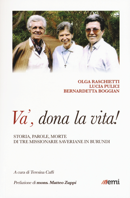 "Una missionaria muore volentieri nella sua terra di missione. E poi a me basta esserci, anche se non potrò fare tante cose". La vita e le opere di tanti missionari e missionarie si possono riassumere in questa frase di Olga Raschietti. Una sorta di testamento scritto pochi giorni prima di venir uccisa con altre due consorelle nella loro abitazione di Kamenge, in Burundi, Paese-simbolo dell'Africa piagata dalla violenza ma anche terra di vitalità e speranza, patria di un popolo indomito in cerca di pace. Esserci prima che fare. Olga, Lucia e Bernardetta sono state annunciatrici di Dio ancor prima di aver fatto del bene in anni di servizio tra popoli diversi: Brasile, Congo, Italia, Burundi, come catechista (Olga), ostetrica (Lucia) e formatrice (Bernardetta). Teresina Caffi racconta i tratti salienti delle loro vite, dà voce ai loro scritti intimi, fa emergere riflessioni spirituali e confidenze con amiche e famigliari. Queste pagine ci restituiscono l'epopea feriale di donne semplici e tenaci, pronte ad affrontare pericoli, rapine, guerre, soprusi e timori per portare a chiunque la materna vicinanza di un Dio che si fa prossimo a ciascuno. "Per la mia vita non temo. Ho già avvisato: se muoio lasciatemi là. Ho sempre desiderato morire in Africa per risorgere il giorno ultimo col popolo africano" (Lucia Pulici).