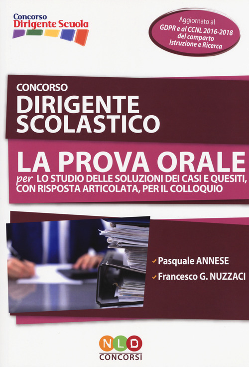"La prova orale per lo studio delle soluzioni dei casi e quesiti, con risposta articolata, per il colloquio" è un testo di facile consultazione che nasce con la chiara idea di fornire un utile ed agile strumento di studio per chi si accinge ad affrontare la prova orale del concorso per dirigenti scolastici, prova che deve "accertare la preparazione professionale del candidato sulle materie d'esame di cui all'art.10 del Decreto 3 agosto 2017, n.138 e sulla verifica della capacità di risolvere un caso riguardante la funzione del dirigente scolastico". Gli 80 studi di casi e gli 80 quesiti, articolati nelle nove tematiche previste dal bando, consentono di approfondire in maniera esaustiva i due grandi ambiti su cui verte la prova orale del concorso a dirigente scolastico relativamente sia agli aspetti più propriamente istituzionali, gestionali e giuridici, sia a quelli inerenti l'attuale assetto degli ordinamenti degli studi, offrendo nel contempo anche un quadro aggiornato e rigoroso delle principali disposizioni legislative e amministrative attualmente vigenti. Nello specifico vengono trattati i temi legati a: a) normativa riferita al sistema educativo di istruzione e di formazione e agli ordinamenti degli studi in Italia con particolare attenzione ai processi di riforma in atto; b) modalità di conduzione delle organizzazioni complesse, con particolare riferimento alla realtà delle istituzioni scolastiche ed educative statali; c) processi di programmazione, gestione e valutazione delle istituzioni scolastiche, con particolare riferimento alla predisposizione e gestione del PTOF, all'elaborazione del Rapporto di Autovalutazione e del Piano di Miglioramento, nel quadro dell'autonomia delle istituzioni scolastiche e in rapporto alle esigenze formative del territorio; d) organizzazione degli ambienti di apprendimento, con particolare riferimento all'inclusione scolastica, all'innovazione digitale e ai processi di innovazione nella didattica; e) organizzazione del lavoro e gestione del personale, con particolare riferimento alla realtà del personale scolastico; f) valutazione ed autovalutazione del personale, degli apprendimenti e dei sistemi e dei processi scolastici; g) elementi di diritto civile e amministrativo, con particolare riferimento alle obbligazioni giuridiche e alle responsabilità tipiche del dirigente scolastico, nonché di diritto penale con particolare riferimento ai delitti contro la Pubblica Amministrazione in danno di minorenni; h) contabilità di Stato, con particolare riferimento alla programmazione e gestione finanziaria presso le istituzioni scolastiche ed educative statali e relative aziende speciali; i) sistemi educativi dei Paesi dell'Unione Europea. Il testo, inoltre, è aggiornato alle ultime novità normative e legislative quali il CCNL 2016-2018 Comparto Istruzione e Ricerca firmato il 19 aprile 2018, il Regolamento (UE) 2016/679 del Parlamento europeo e del Consiglio del 27 aprile 2016, entrato in vigore il 25 maggio 2018, ed il Decreto 28 agosto 2018, n.129 (Regolamento recante istruzioni generali sulla gestione amministrativo-contabile delle istituzioni scolastiche, ai sensi dell'art. 1, co. 143, della L. 13 luglio 2015, n. 107), entrato in vigore il 17 novembre 2018.