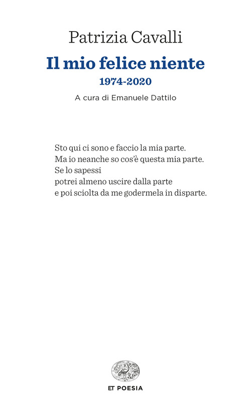 Una scelta dei versi essenziali di Patrizia Cavalli che dà corpo a una delle voci poetiche più necessarie del nostro tempo. Ci sono poeti che hanno il dono prezioso di dare una immediata, irresistibile felicità a chi li legge. Patrizia Cavalli è senz'altro tra questi. Non importa di che cosa parli: se di risvegli lenti tra le lenzuola mattutine o della pasta che va scolata in fretta, all'istante giusto - tutto ciò che questa lingua poetica nomina sembra toccarci immediatamente, come se rivelasse ogni volta, nel modo più esatto, qualcosa che ci appartiene e che forse abbiamo solo dimenticato. E non importa definirla: è semplice, eppure è anche ricca, complessa, variegata; è saggia e filosofa, ma anche istintiva, innamorata, visionaria. È comica e tragica, dolorosa. Capace di rimanere sempre se stessa - e, solo così, di sorprenderci ogni volta. Tutti gli strumenti critici e interpretativi, di fronte ai suoi versi, sembrano cadere - e non è detto che sia un male. Quel che resta da fare, allora, è semplicemente leggerla.