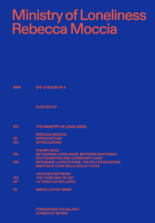 Pubblicato con Fondazione ICA Milano, Ministry of Loneliness riproduce e amplia la ricerca che Rebecca Moccia ha presentato in occasione della mostra omonima. Partendo dall'esplorazione del Ministero della Solitudine - istituito nel 2018 in Regno Unito e replicato nel 2021 in altri Paesi come Canada e Giappone - il lavoro dell'artista sviluppa una riflessione sulle strutture politiche e sociali che plasmano lo stato emotivo della solitudine e la sua percezione nella società contemporanea. Nel progetto, che nasce da un viaggio di ricerca tra Italia, Stati Uniti, Giappone e Regno Unito, l'ombra fantasmatica e pervasiva dell'isolamento che permea le società occidentali prende forma in un'indagine stratificata estendendosi alle radici che la innescano: dall'avanzamento dell'ordine tecno-scientifico della vita moderna all'ascesa del capitalismo liberale. Il volume riproduce, nella sua interezza, la raccolta di appunti che ha costituito la base del progetto di Moccia - un collage digitale dai tratti diaristici, formato da testi, immagini, report e riflessioni su diverse tipologie di documenti. I testi critici di Chiara Nuzzi - curatrice della mostra - e Vincenzo Estremo ampliano a livello teorico il lavoro di Rebecca Moccia, facendo emergere come tra solitudine e individualizzazione sussista un rapporto dialettico indissolubilmente legato ai modi di produzione nel tardo-capitalismo.