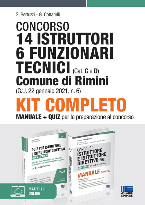Il presente kit è un utilissimo strumento di preparazione alle prove previste dai bandi di concorso per 14 Istruttori (Cat. C) e 6 Funzionari Tecnici (Cat. D), indetti dal Comune di Rimini. I bandi prevedono di selezionare i candidati attraverso le seguenti prove: prova scritta: quiz a risposta multipla sulle materie richieste dal bando; prova scritta: test composto da quesiti a risposta aperta sulle materie richieste dal bando; prova orale: colloquio sulle materie delle prove scritte e accertamento della conoscenza della lingua inglese, delle applicazione informatiche più diffuse e del programma "autocad LT". Il kit è composto da: manuale di preparazione "Istruttore e Istruttore direttivo area tecnica" (ed. 2020); raccolta di quesiti a risposta multipla "Quiz per istruttore e istruttore direttivo area tecnica" (ed. 2020) che permette la veloce e sicura autoverifica di quanto appreso e, allo stesso tempo, di esercitarsi e familiarizzare con la tipologia di prova a quiz. I volumi sono aggiornati alle più recenti normative: Decreto Semplificazioni (D.L. n. 76/2020 convertito con modificazioni dalla Legge n. 120/2020); Decreto Rilancio (D.L. n. 34/2020 convertito con modificazioni dalla Legge n. 77/2020); Decreto sulla prestazione energetica in edilizia (D.lgs. n. 48/2020); Decreto sulla normativa antincendio delle autorimesse (D.M. 15 maggio 2020).